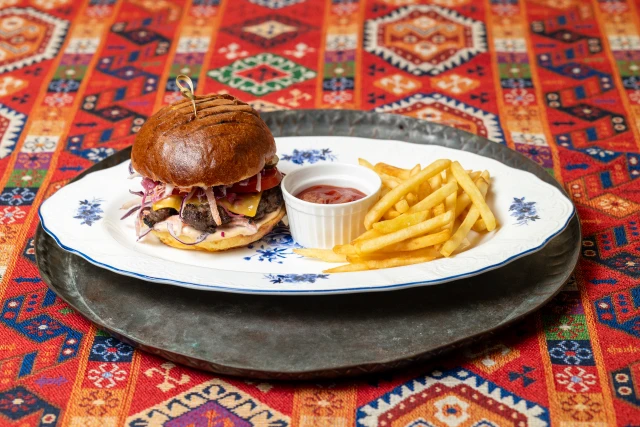 Бургер с говядиной, фри и кетчупом