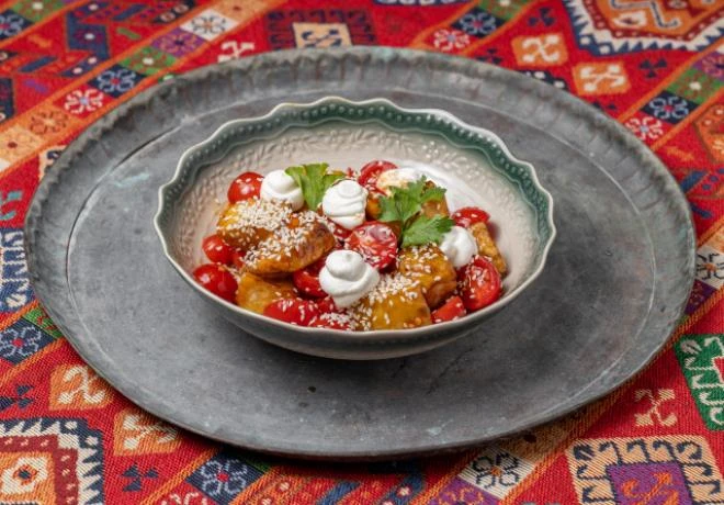 Хрустящие баклажаны с сочными томатами в кисло-сладком соусе и чиз-кремом. Посыпаем кунжутом и утверждаем, что он у нас один из самых вкусных!