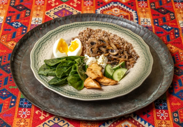 Греча, куриное филе, яйцо, шампиньоны, рукола