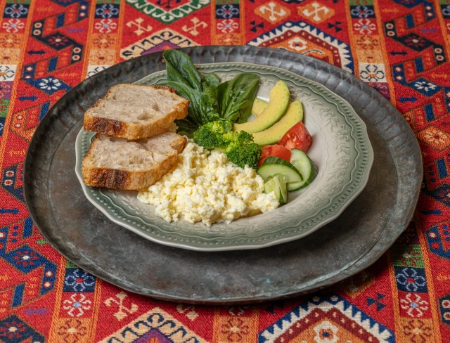 Омлет, авокадо, свежие огурцы, помидоры черри, брокколи, шпинат, руккола, крем-чиз и хлеб тартин